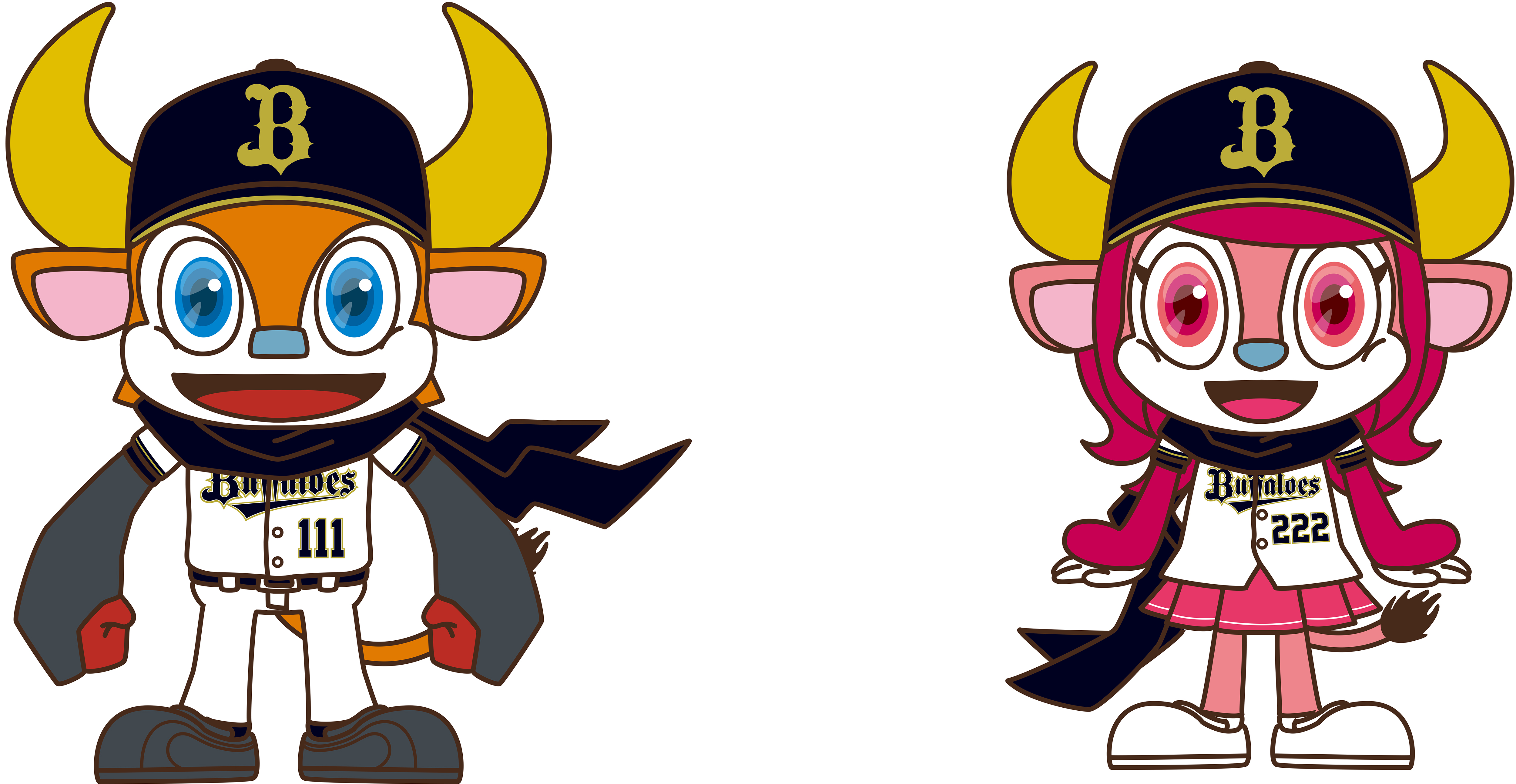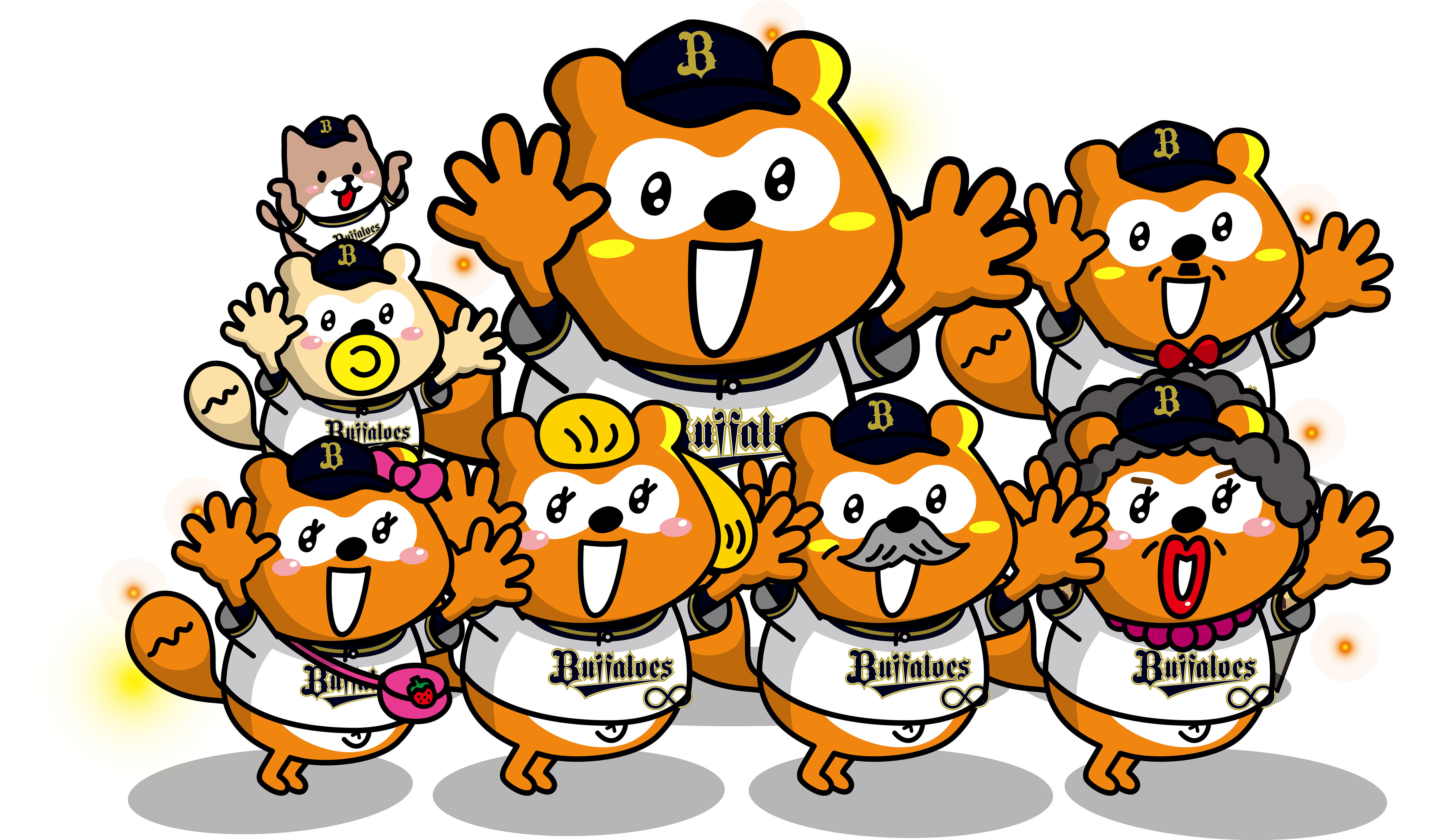 첫 번째 사진이 오릭스 버팔로즈의 메인 마스코트이자 여성 마스코트인 버팔로 불과 버팔로 벨의 기본형이고요. 두 번째 사진이 버팔로즈☆폰타로 불리는 오릭스 버팔로즈의 홈 유니폼을 착용하고 있는 폰타 패밀리들입니다. 두 번째 사진이 얼마 전에 확보했던 자료라 이번 게시물의 하이라이트가 되겠습니다.